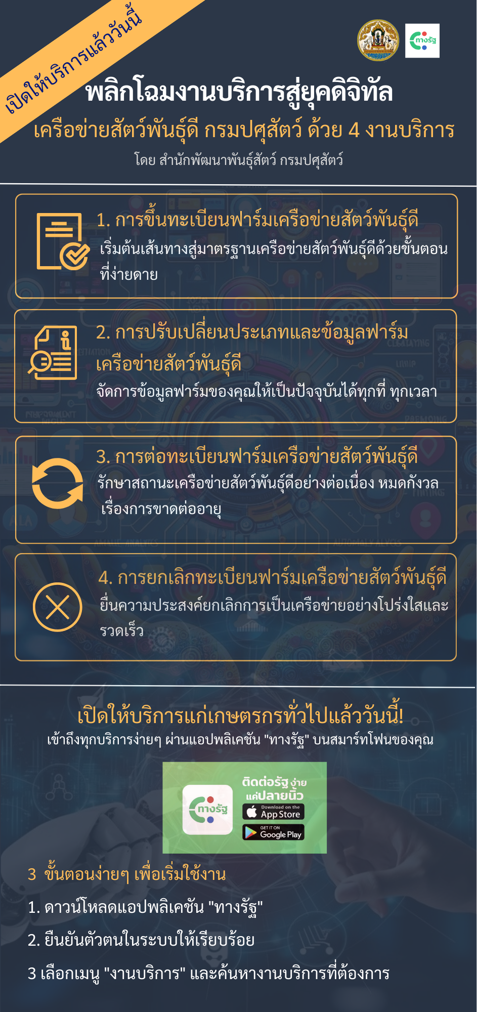 กรมปศุสัตว์ โดยสำนักพัฒนาพันธุ์สัตว์ เดินหน้าขับเคลื่อนนโยบายการปฏิบัติราชการทางอิเล็กทรอนิกส์ เพื่ออำนวยความสะดวกแก่เกษตรกรในการเข้าถึงบริการภาครัฐได้อย่างมีประสิทธิภาพ ล่าสุดได้เปิดให้บริการดิจิทัลด้าน "เครือข่ายสัตว์พันธุ์ดี" บนแอปพลิเคชัน "ทางรัฐ" อย่างเต็มรูปแบบ