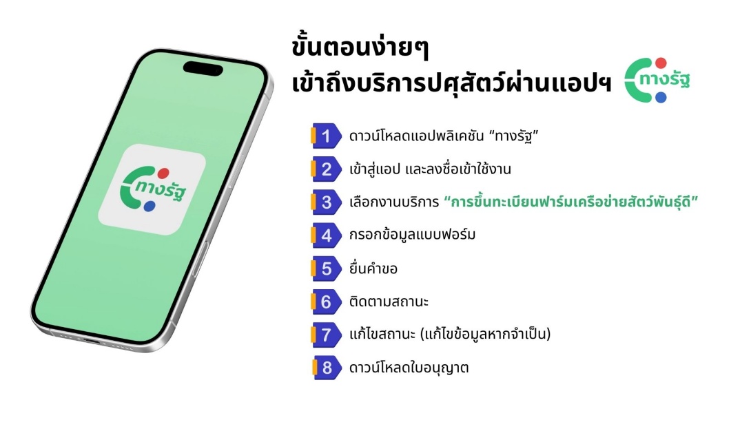 ผู้ที่สนใจสามารถเข้าถึงบริการได้โดยดาวน์โหลดแอปพลิเคชัน "ทางรัฐ" ผ่านสมาร์ทโฟน และดำเนินการยืนยันตัวตนตามมาตรฐานความปลอดภัย เพื่อเริ่มใช้งานบริการของกรมปศุสัตว์และหน่วยงานภาครัฐอื่นๆ ได้ทันที
